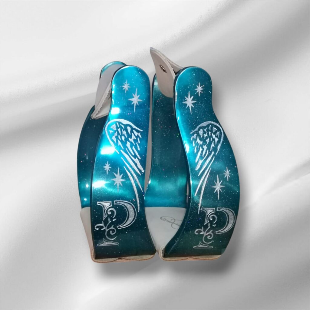 Unsere individuell verzierten und gebrannten Steigbügel machen jedes Pferde-Outfit komplett – egal ob Show, Freizeit oder Training.